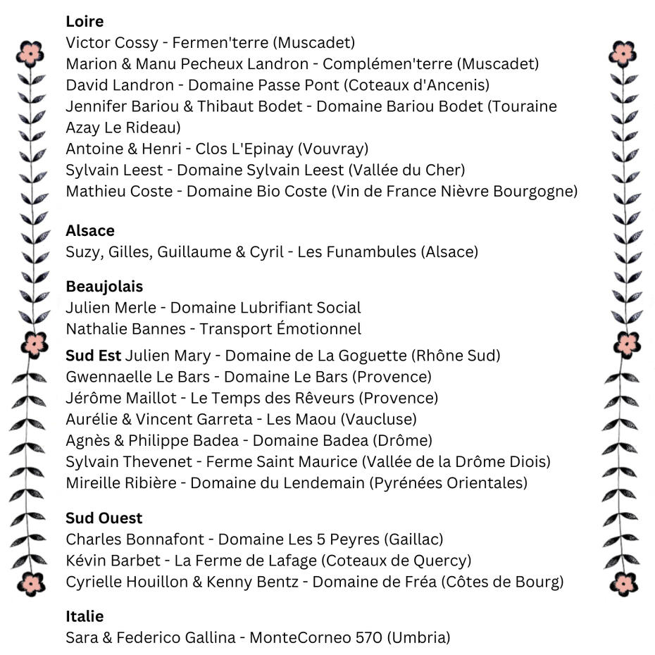 Cette première édition regroupe une vingtaine de vigneronnes et vignerons de France et d'Italie, toutes et tous engagé.e.s dans le vivant. La liste complète est ici !