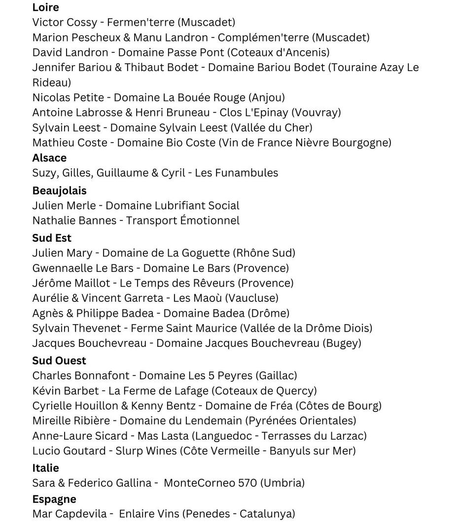 Cette deuxième édition regroupe 26 de vigneron.ne.s de France d'Italie et d'Espagne, toutes et tous engagé.e.s dans le vivant. La liste complète est ici !